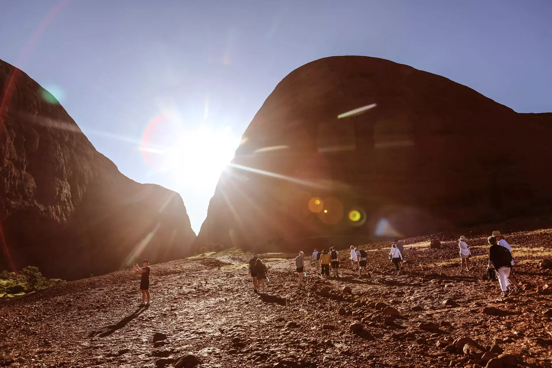 Witness the iconic Uluru and Kata Tjuta at dawn on a guided base walk. Experience the spiritual and natural beauty of the desert landscape as the rising sun casts its hues over the ancient rock formations, revealing their timeless stories and cultural significance.