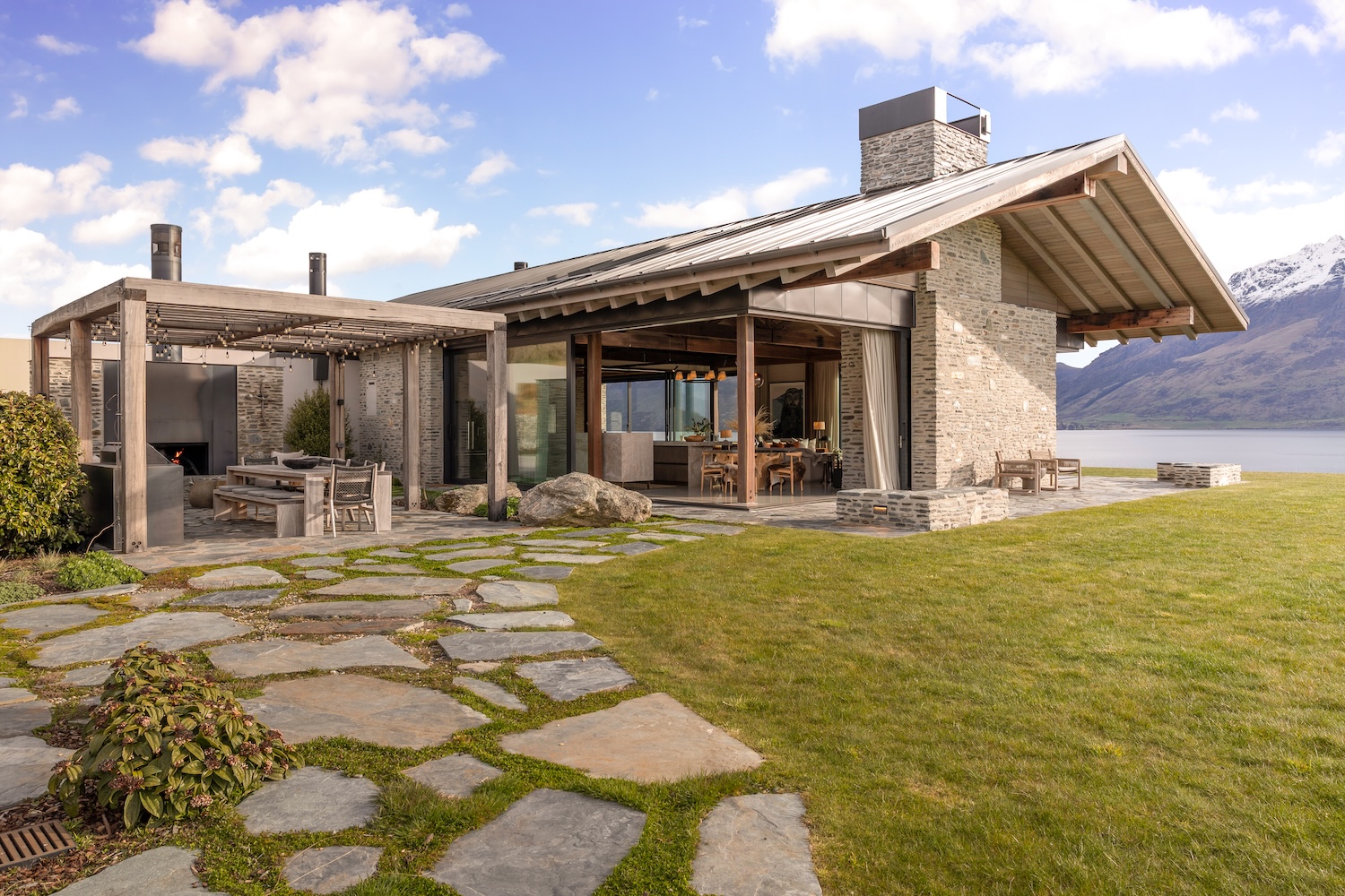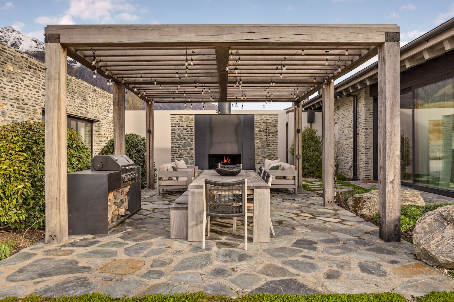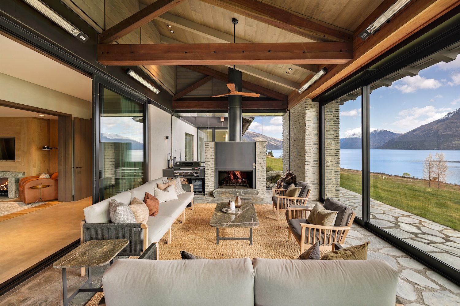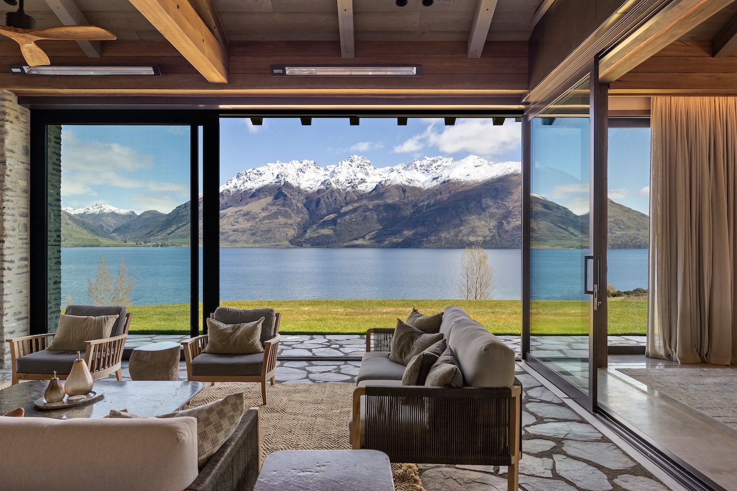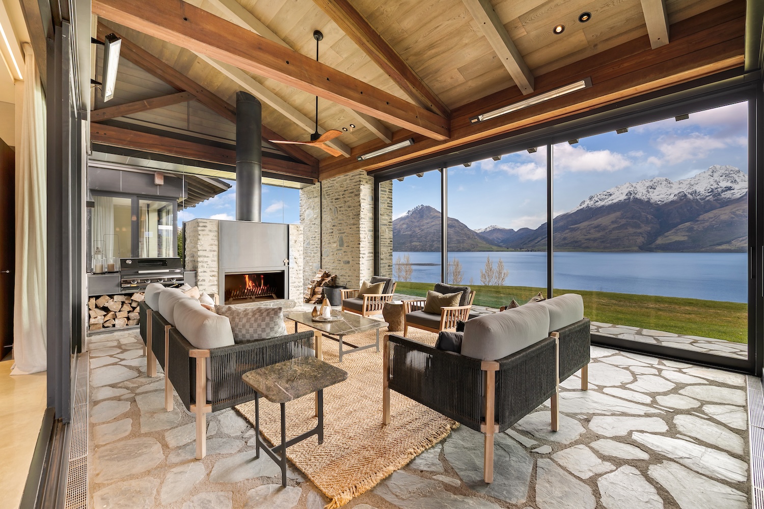 Outdoors, Homestead Bay makes the most of its absolute lakefront setting. Multiple terraces and a covered pergola with fireplace create inviting spaces for entertaining and unwinding, while uninterrupted views across Lake Wakatipu and the surrounding mountains provide a spectacular backdrop at every hour of the day.