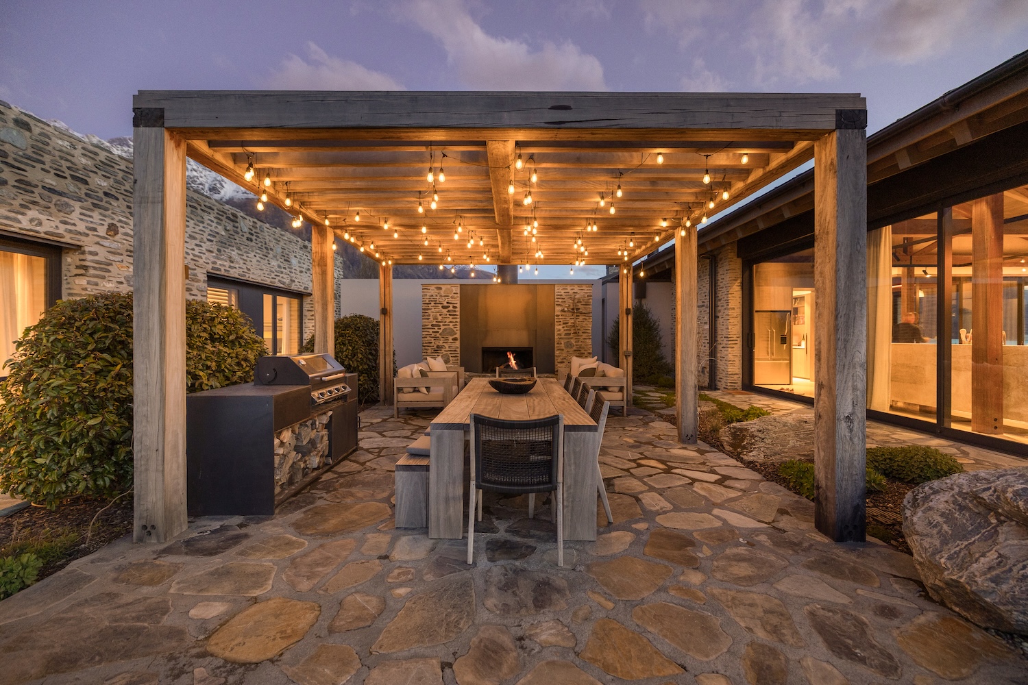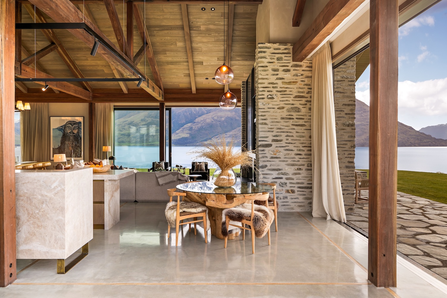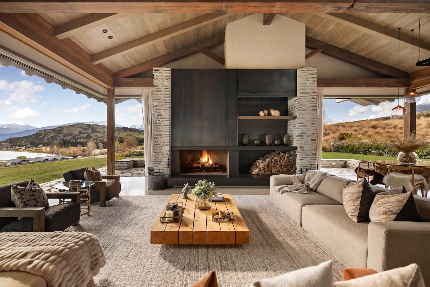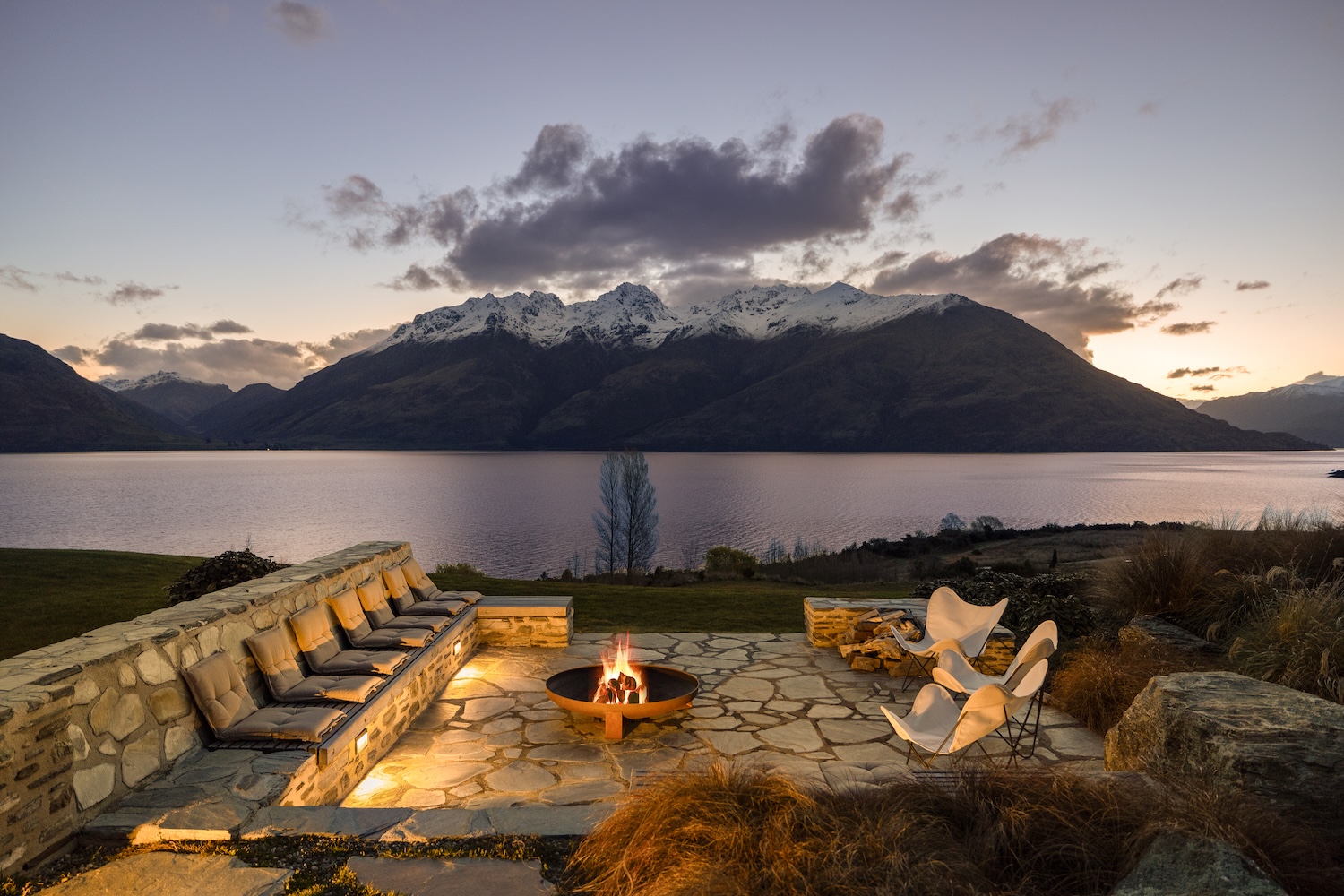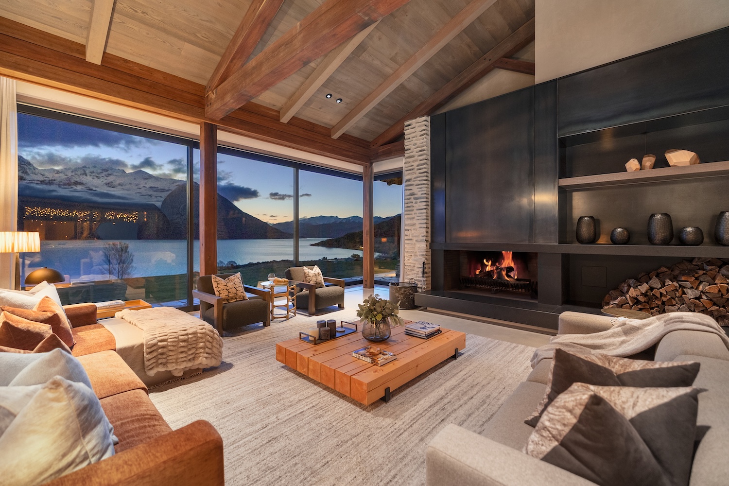 Outdoors, Homestead Bay makes the most of its absolute lakefront setting. Multiple terraces and a covered pergola with fireplace create inviting spaces for entertaining and unwinding, while uninterrupted views across Lake Wakatipu and the surrounding mountains provide a spectacular backdrop at every hour of the day.