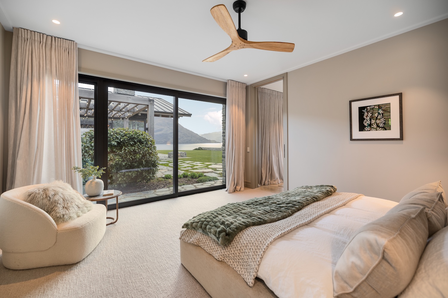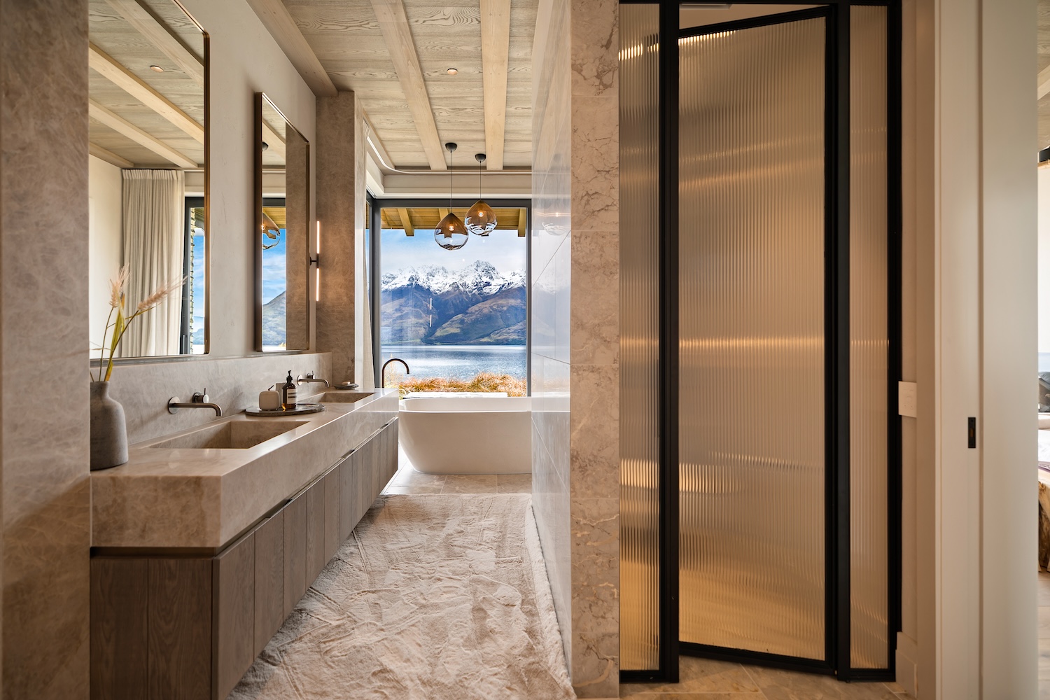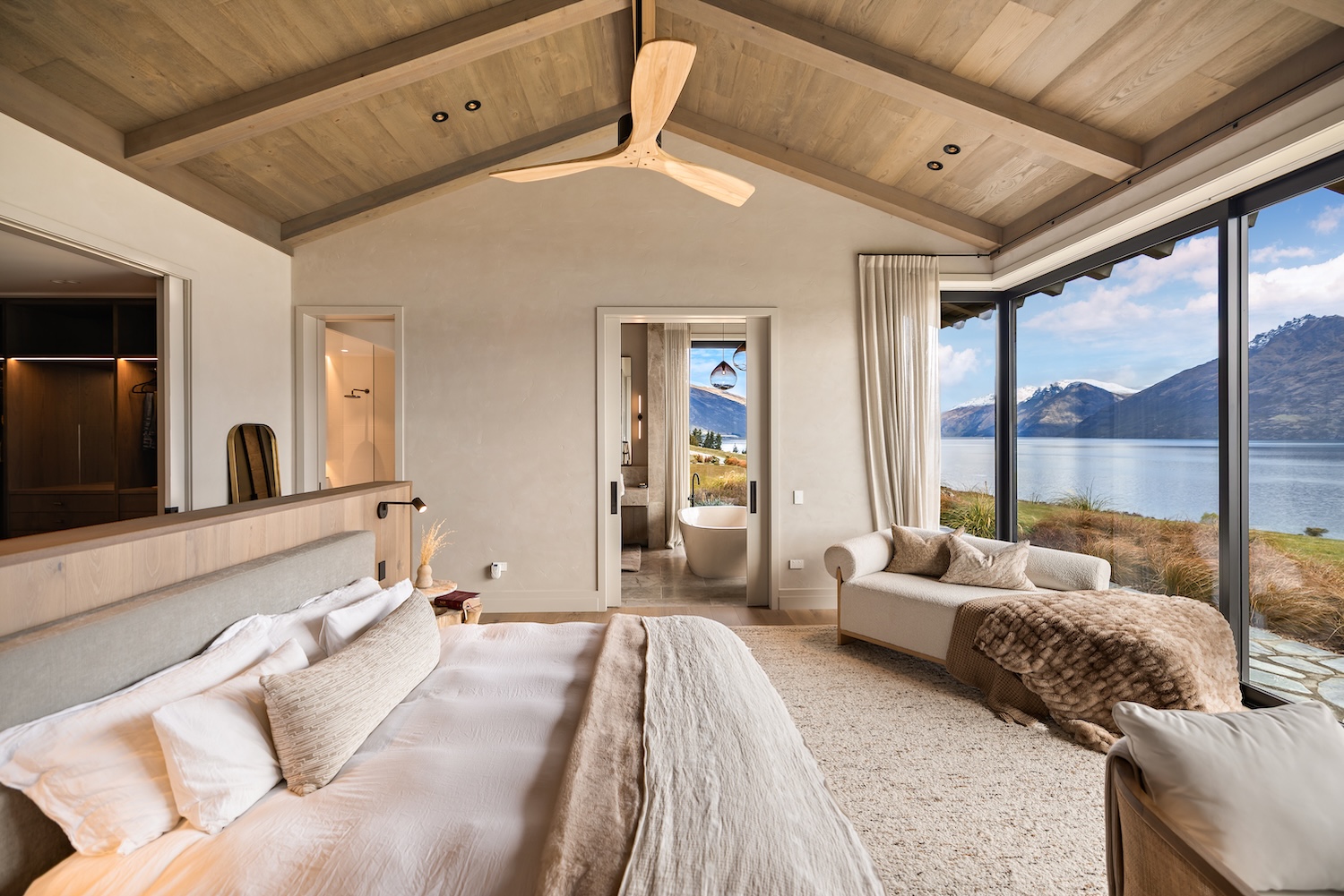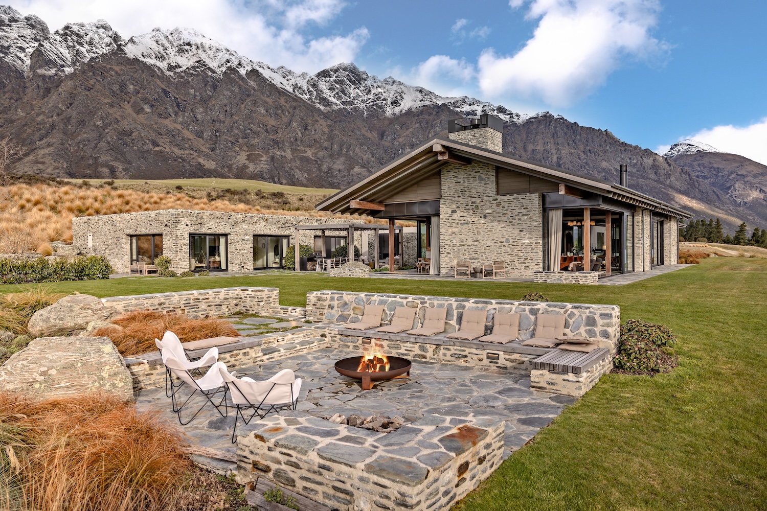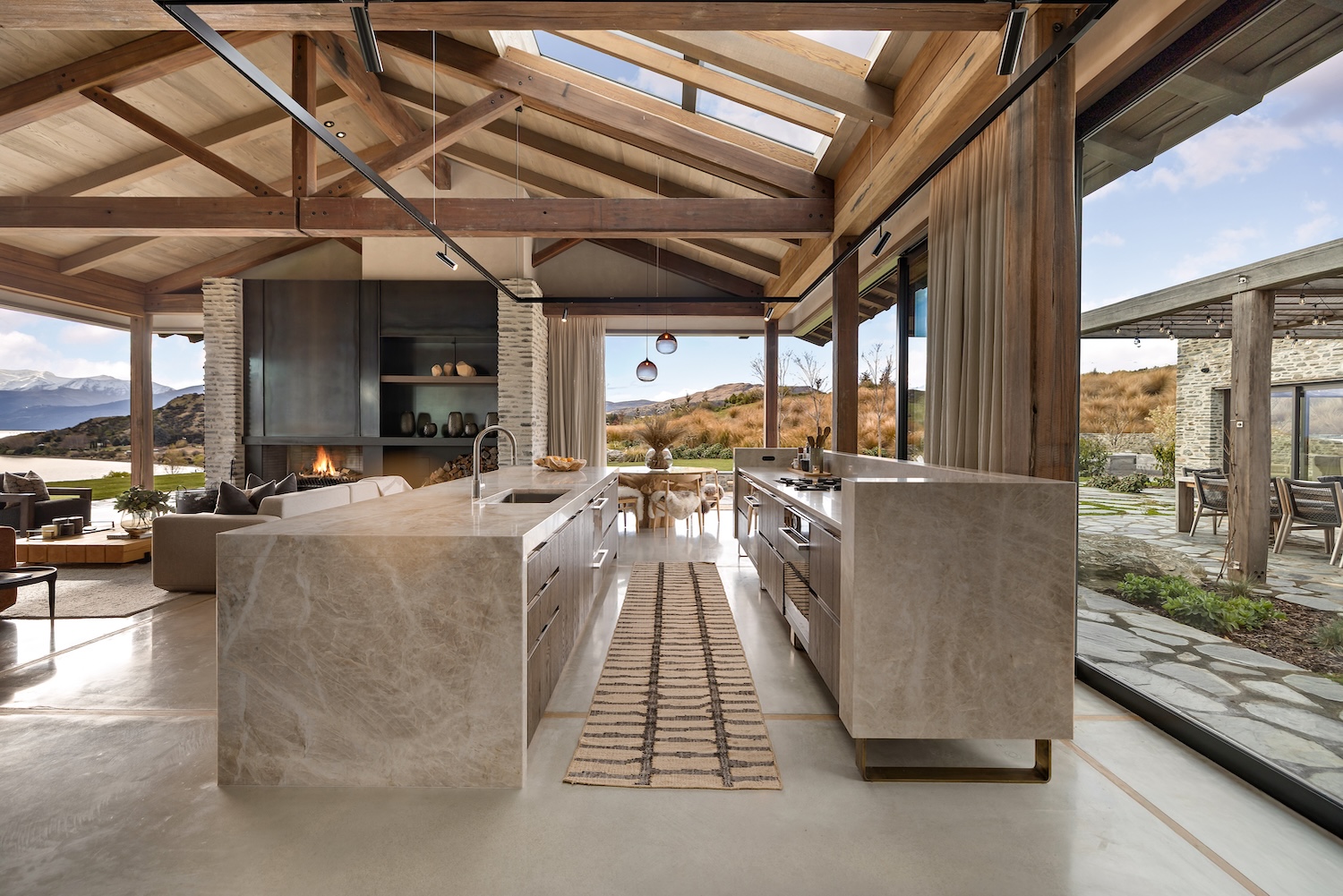 Outdoors, Homestead Bay makes the most of its absolute lakefront setting. Multiple terraces and a covered pergola with fireplace create inviting spaces for entertaining and unwinding, while uninterrupted views across Lake Wakatipu and the surrounding mountains provide a spectacular backdrop at every hour of the day.