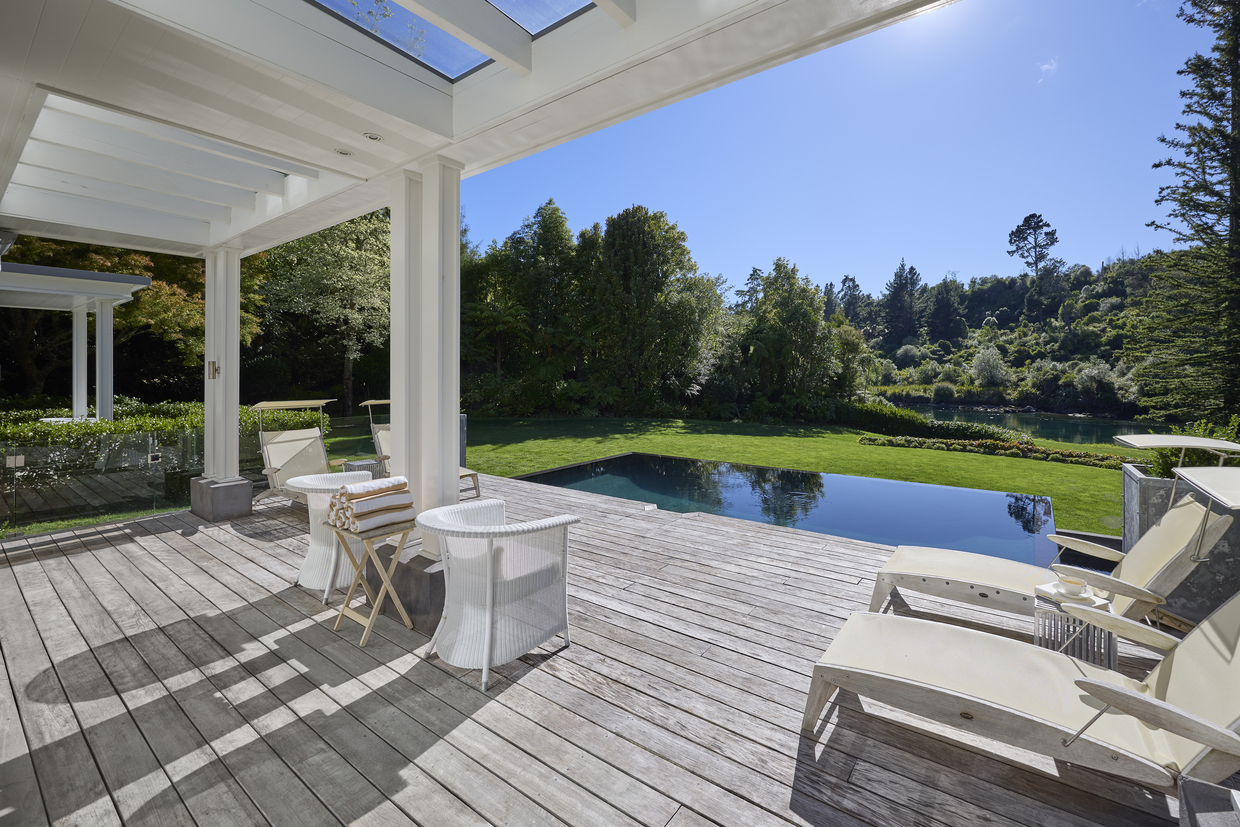 Alan Pye Cottage takes every advantage of a superb location and sits above lush rolling green lawns and manicured gardens on the banks of the Waikato River, where the powerful and hypnotic turquoise green waters surge downstream on their way to the Huka Falls.