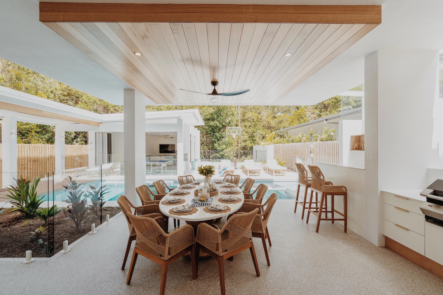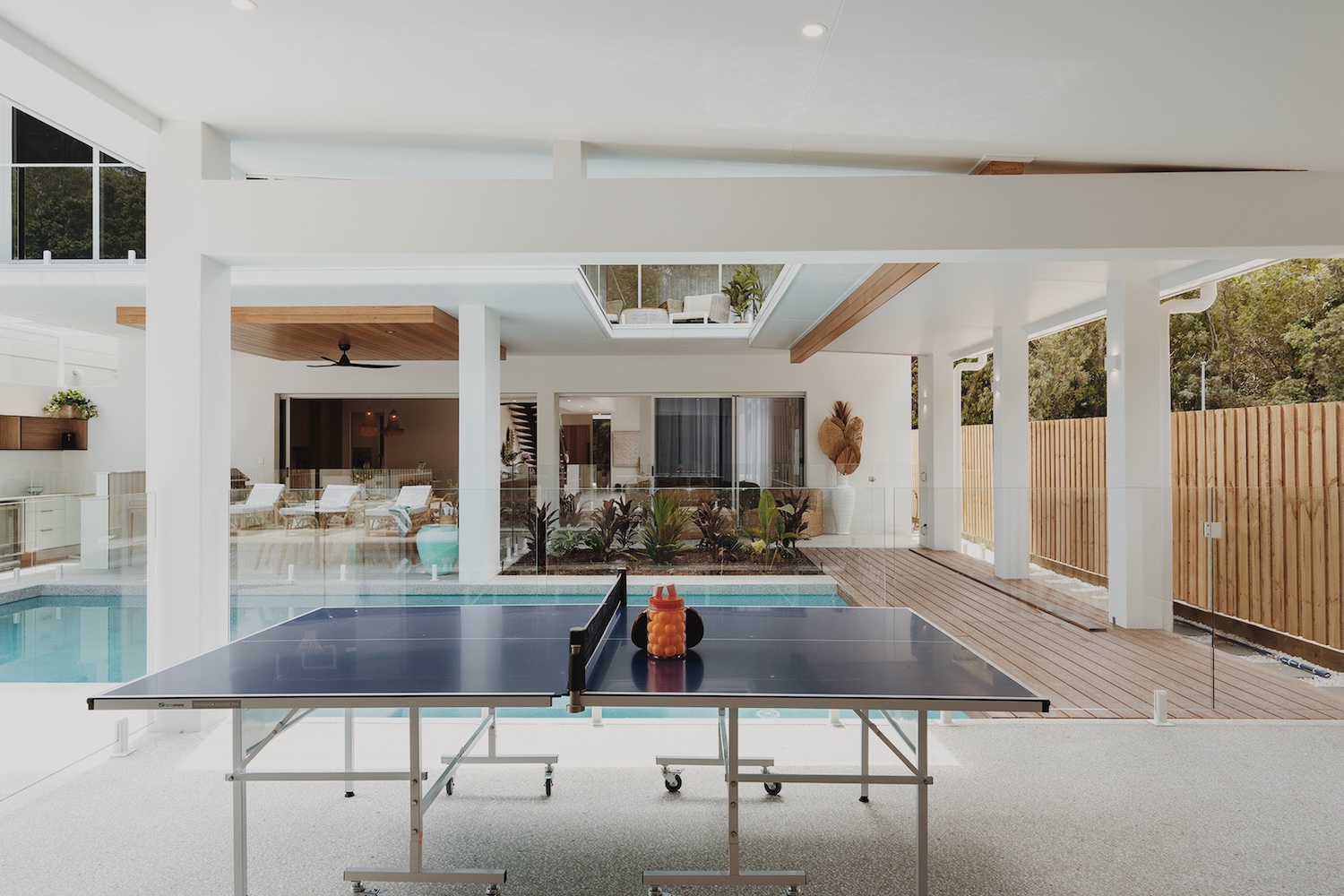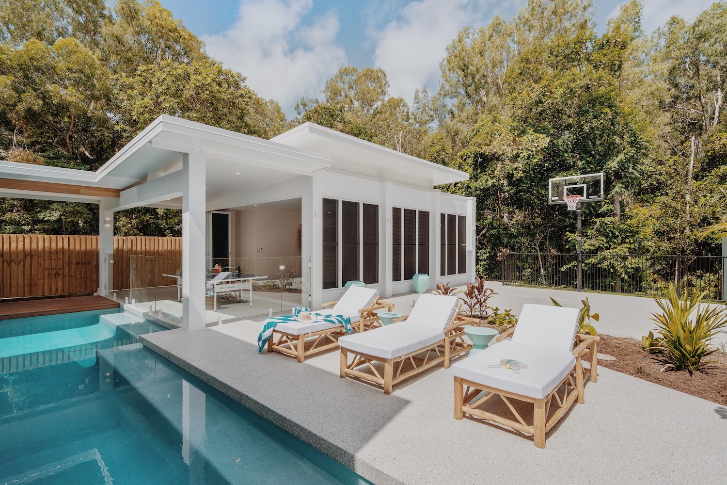 Outside, the villa flows into lush outdoor entertaining zones built for sunshine and serenity. Centre stage is a heated pool (warmer during winter months), surrounded by a sun terrace, BBQ zone and a games room — complete with ping-pong and basketball hoop — ideal for casual fun or relaxed afternoons. The easy indoor-outdoor connection makes it effortless to move between lounging inside and embracing the tropical atmosphere outside.