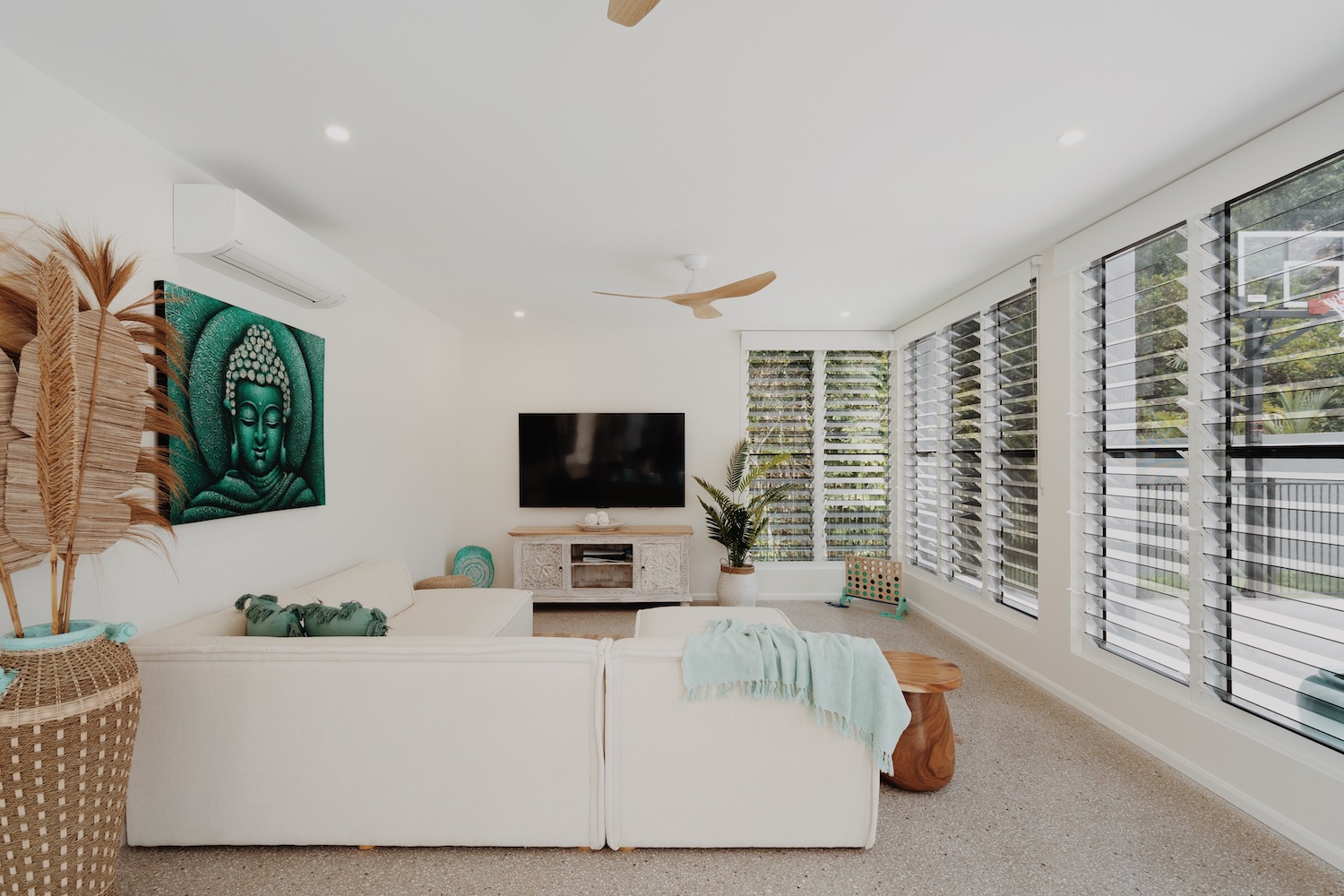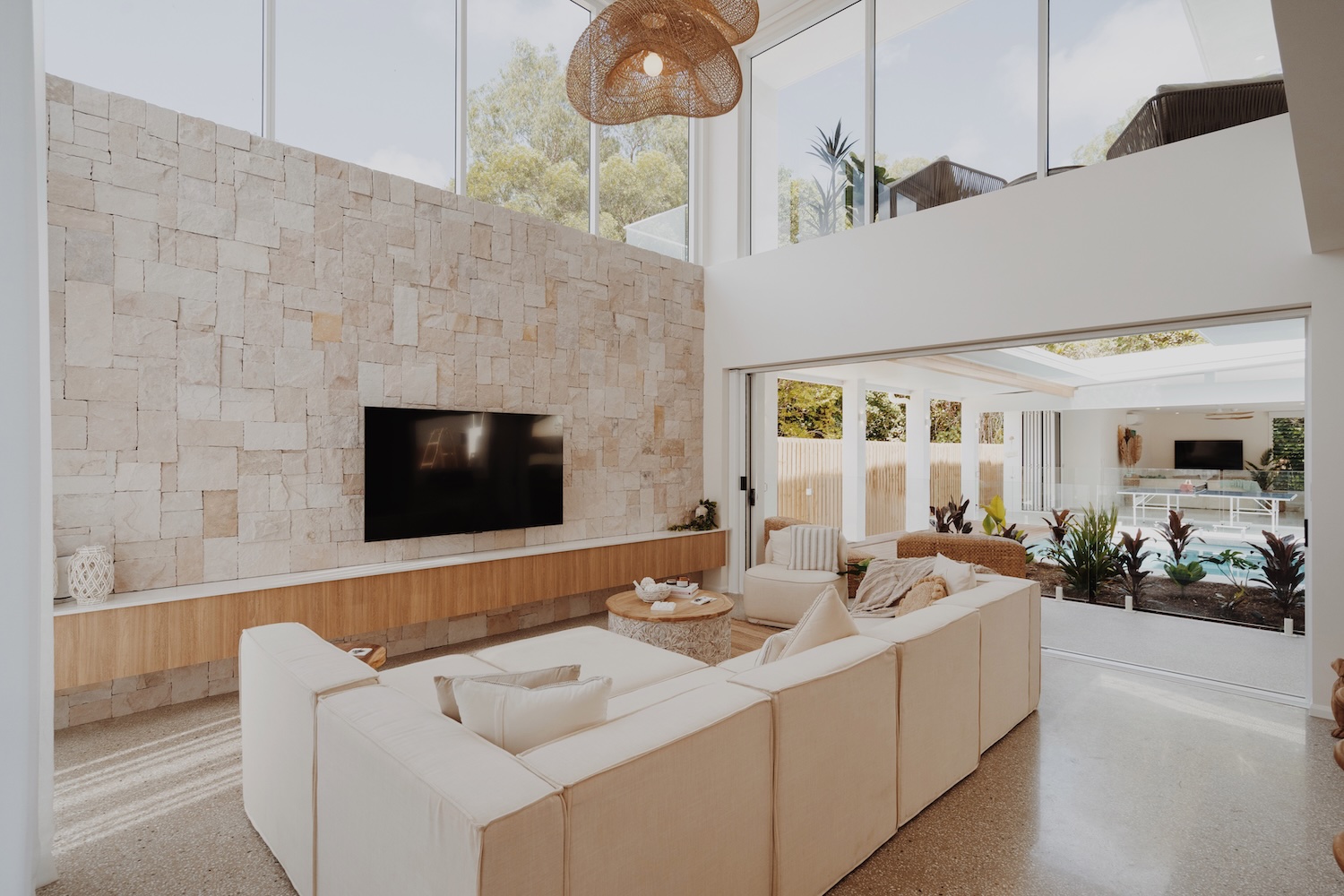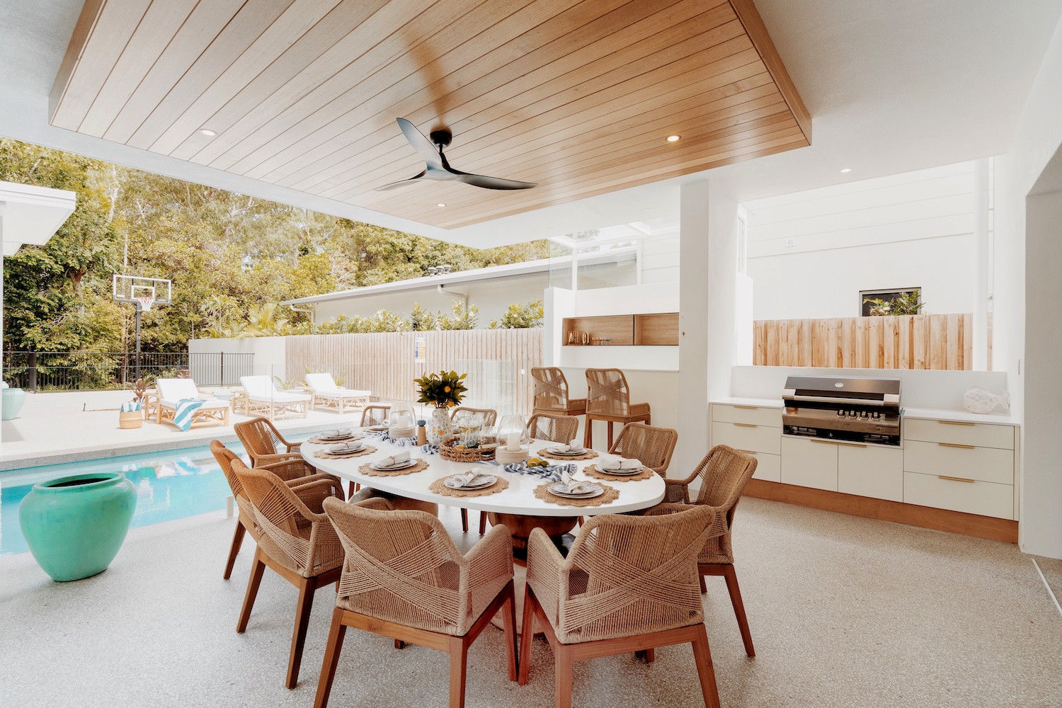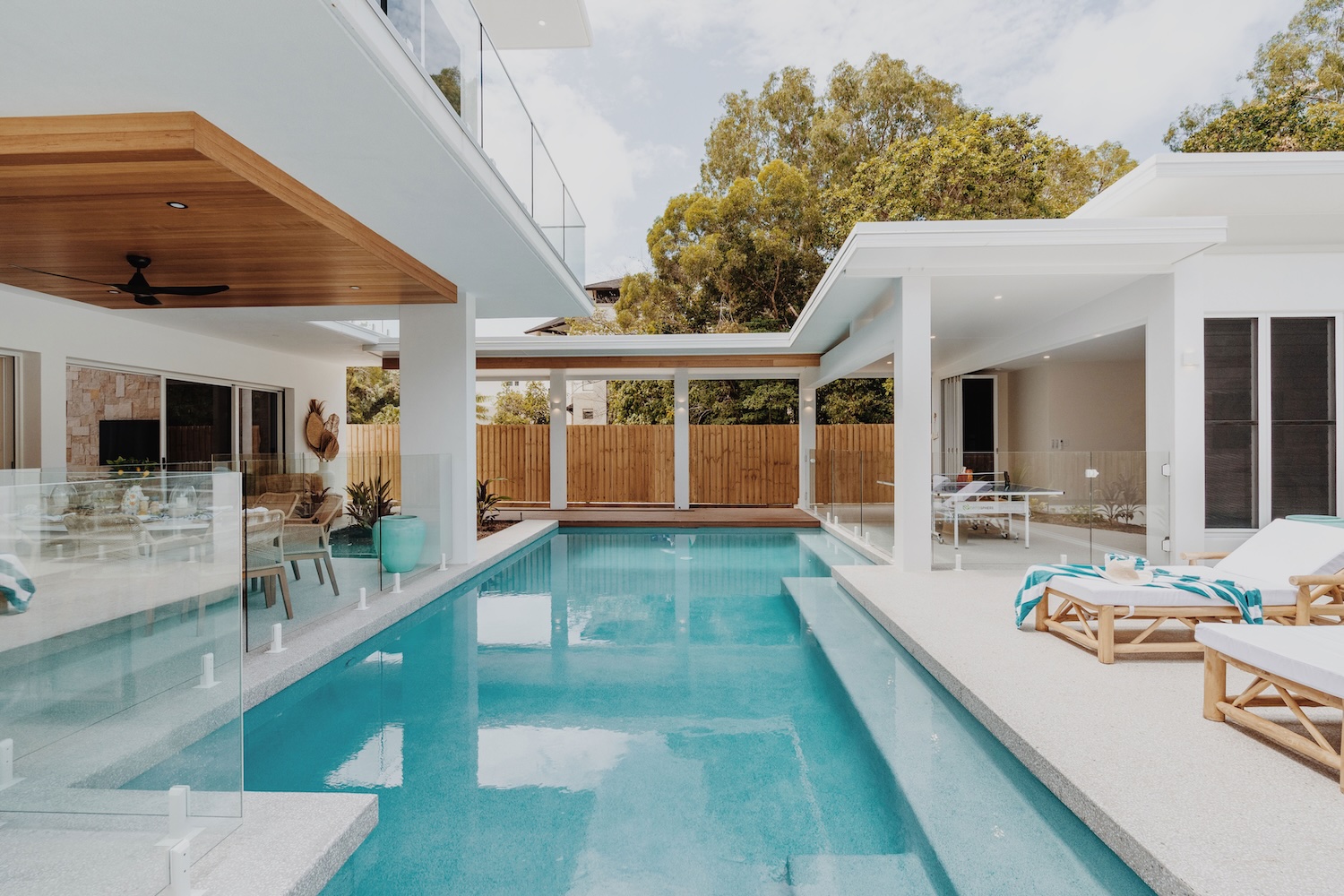 Outside, the villa flows into lush outdoor entertaining zones built for sunshine and serenity. Centre stage is a heated pool (warmer during winter months), surrounded by a sun terrace, BBQ zone and a games room — complete with ping-pong and basketball hoop — ideal for casual fun or relaxed afternoons. The easy indoor-outdoor connection makes it effortless to move between lounging inside and embracing the tropical atmosphere outside.