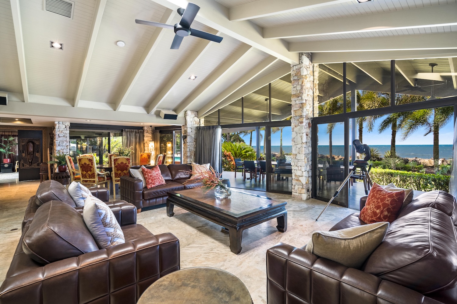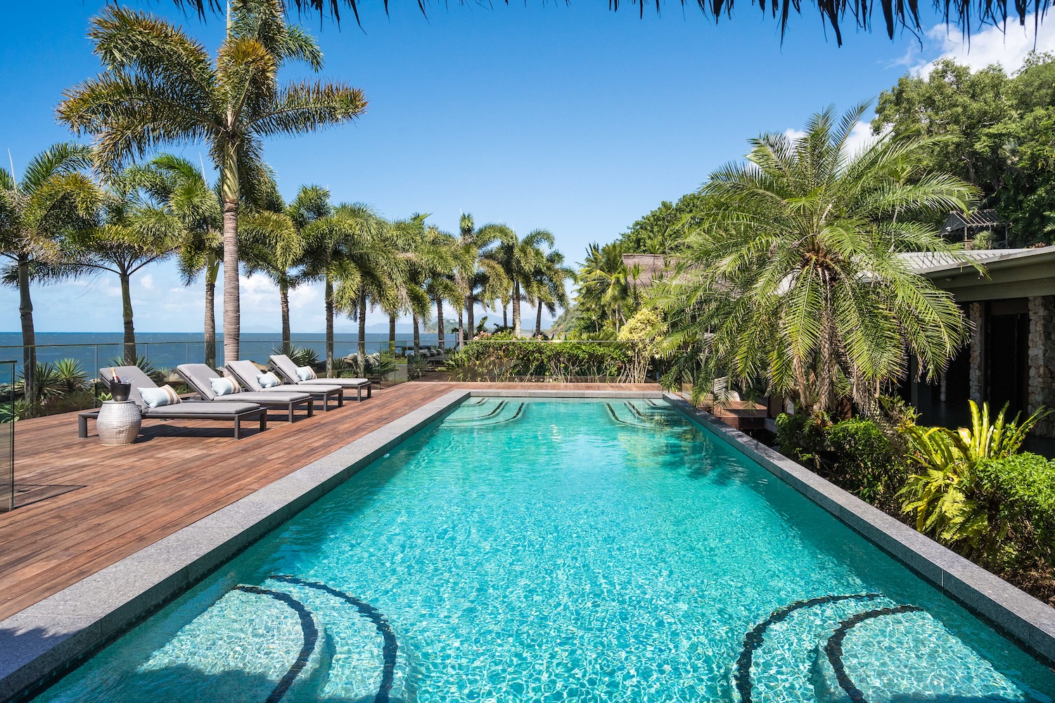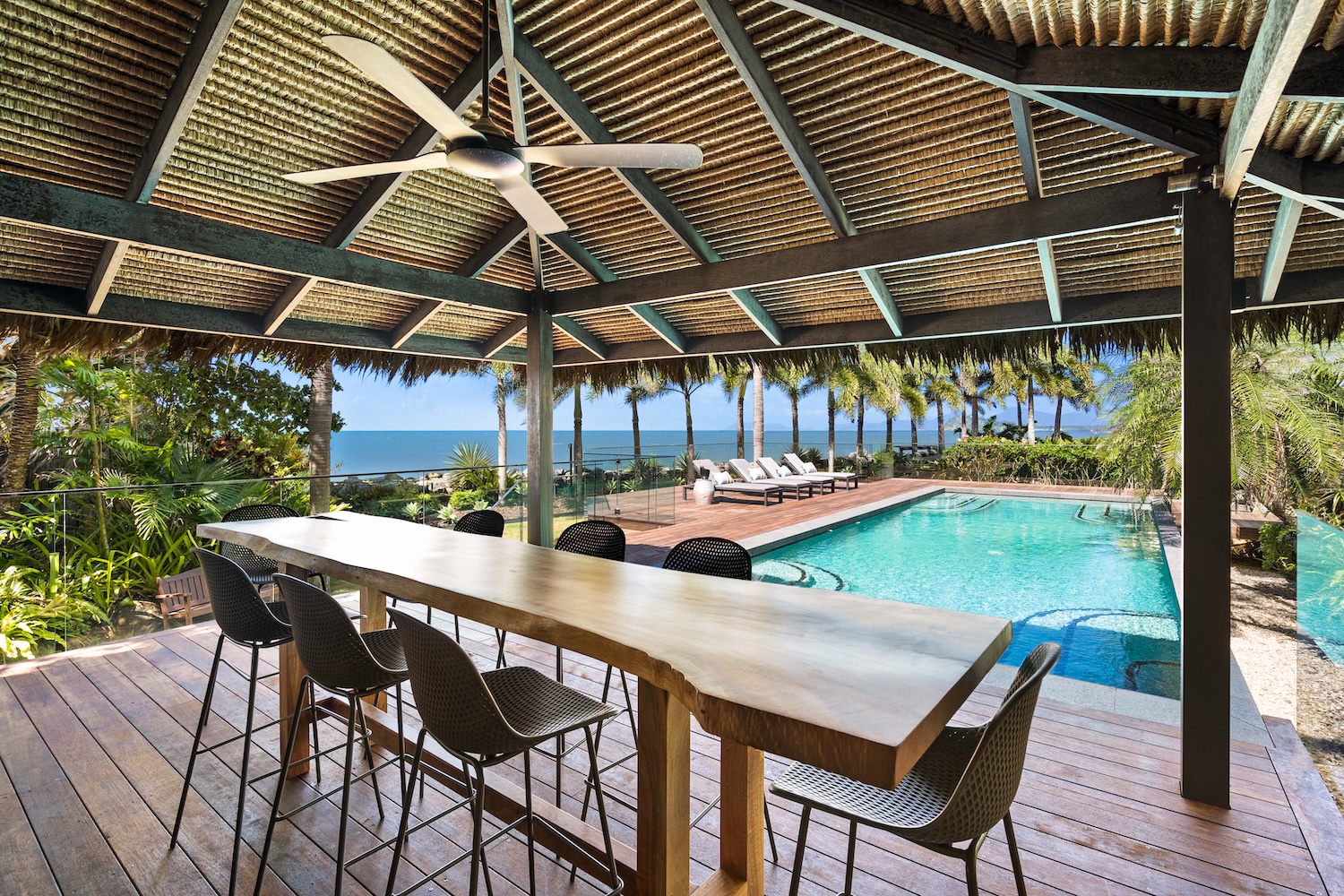 Outdoors, the spirit of the property truly comes to life. A 13-metre climate-controlled pool is framed by tropical gardens and timber decking, inviting sun-drenched afternoons and leisurely swims. A poolside dining pavilion with a fully equipped outdoor kitchen becomes a natural gathering point, while three distinct bar areas — including one privately positioned at the ocean’s edge — elevate every moment spent by the water.